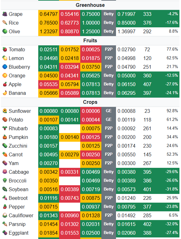 For the best crop to buy with SFL and sell for Coins, find the row with the lowest negative percentage (Betty, highlighted green). In the example above, you would want to buy Parsnips, since they’re slightly lower than Soybeans. If you bought 30 SFL worth of them at these prices, you would be able to get 2063 (rounded down, since you can only buy whole units of any resource, and provided you can find someone selling 63 units in one listing), and then sell those at 6.5 coins each for a total of 13409.5.